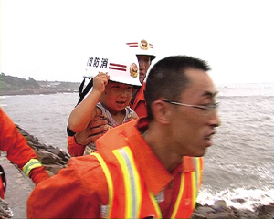 半個多小時過后,島上居民終于表示愿意跟隨救援人員離島避風。救援人員抱著孩子、攙著老人、躲著巨浪,一批一批地將群眾及時轉移。