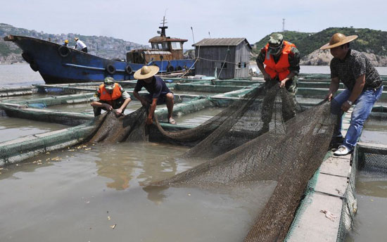 8月4日,在浙江臺州釣浜港附近海域,邊防官兵幫助海上養殖戶加固網箱。