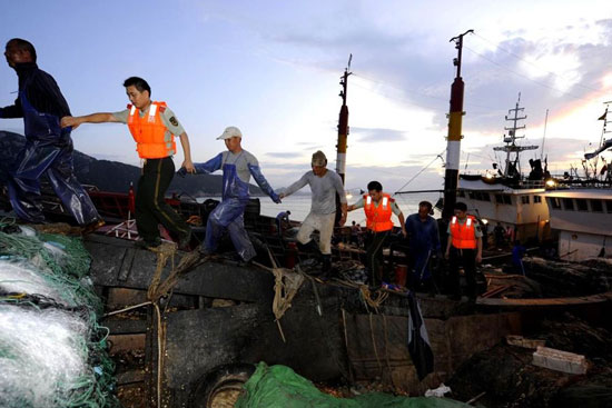 8月5日,浙江舟山朱家尖邊防派出所官兵在碼頭幫助漁民整理漁具,準備撤離至安全地帶。