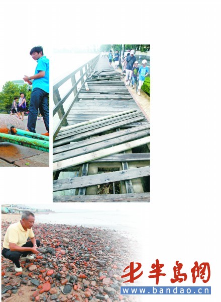 音樂廣場地磚大面積被掀翻、由三個石墩固定長達10多米的護欄被連根拔起、十幾米長的木棧道也被海浪打得破爛不堪……雖然“梅花”與青島擦肩而過 ,但是對沿海的一些公用設施破壞卻不輕。8月8日,記者在沿海探訪發現海邊公用設施損壞嚴重,目前相關部門已經展開修復工作。