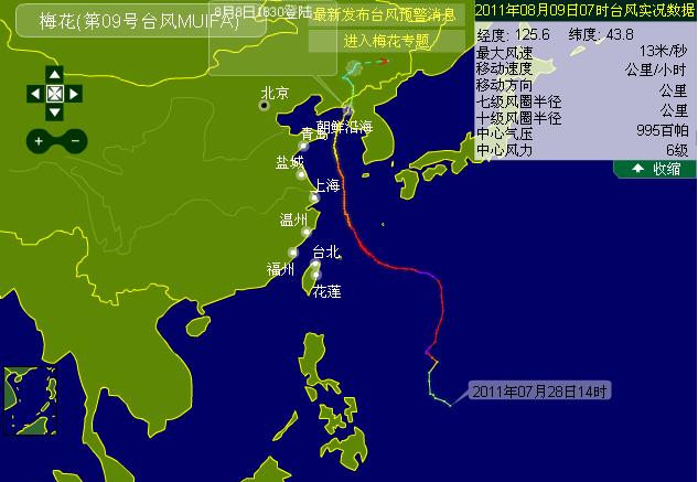 預計“梅花”將以每小時30-35公里的速度繼續向東北方向移動,強度繼續減弱,由于“梅花”對我國的影響趨于減小,因此中央氣象臺于今天6時解除了臺風的藍色預警。但受“梅花”殘余云系的影響,今天8時到明天(10日)8時,遼寧沿海仍將有6到7級的大風,遼寧中東部、吉林中東部、黑龍江中東部有大雨,其中黑龍江東北部有暴雨。