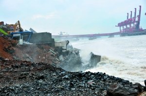 防波堤垮塌現場(8月8日攝)。目前海水暫時被控制住。新華社記者 閆平 攝