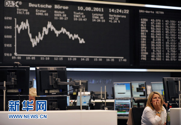 8月10日,交易員在德國法蘭克福證券交易所工作。當(dāng)日,德國法蘭克福股市DAX指數(shù)在前一交易日微跌0.10%之后,繼續(xù)大跌303.66點,收于5613.42點,跌幅達(dá)5.13%,這已經(jīng)是法蘭克福股市DAX指數(shù)連續(xù)11個交易日下跌。新華社記者馬寧攝