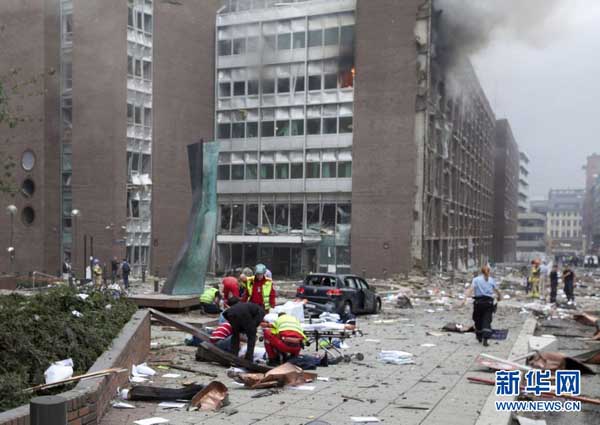 7月22日,救援人員在挪威奧斯陸市爆炸現場忙碌。新華社/美聯