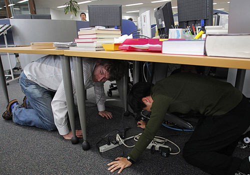 美聯(lián)社在日本東京的公辦地點,工作人員在桌下避難。
