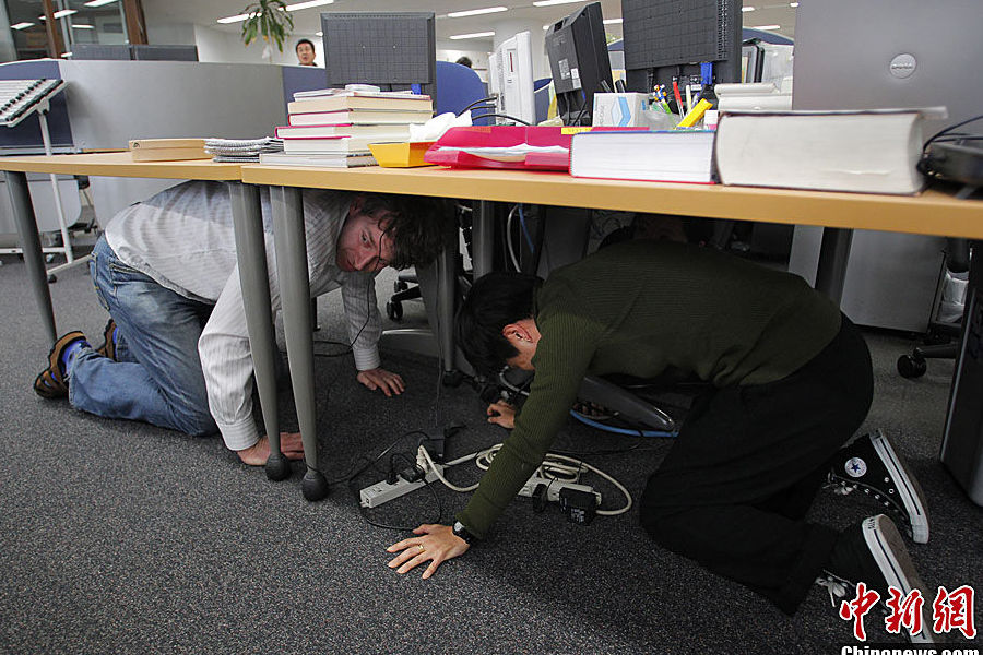 圖為美聯社在日本東京的公辦地點,工作人員在桌下避難。