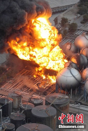 日本近海3月11日發(fā)生了強(qiáng)烈地震,首都東京震感強(qiáng)烈。日本氣象廳隨即發(fā)布了海嘯警報(bào),稱地震將引發(fā)約10米高海嘯。圖為日本千葉縣市原市煉油廠儲(chǔ)油罐發(fā)生連環(huán)爆炸。