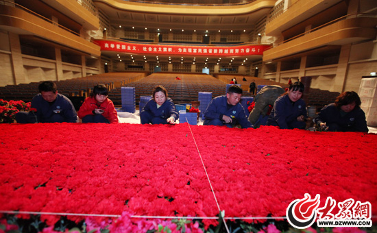 山東會堂內,七八名工人正在緊張工作,六千支鮮花裝扮會場迎接“兩會”召開。(曹亮 劉國棟 韋國騫 攝影報道)