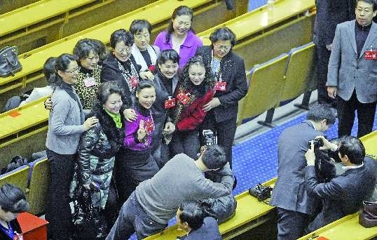 山東省政協十屆四次會議于2月16日上午閉幕。圖為閉幕大會間隙,幾位女委員正在會場合影留念。 本報記者 王媛 攝