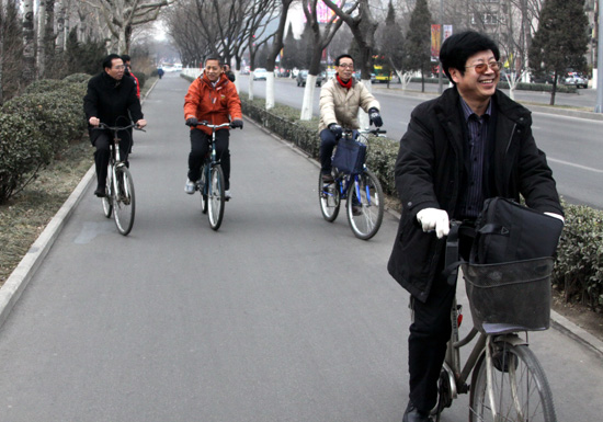 今天是山東省政協十屆四次會議與會委員報道的日子。為踐行低碳環保,給市民帶個好頭兒,省政協委員董利忠、宋傳杰、陳寶明、王福泰等下午騎自行車來到山東大廈向大會報到。隨后,宋傳杰、陳寶明兩位委員騎車前往住地。