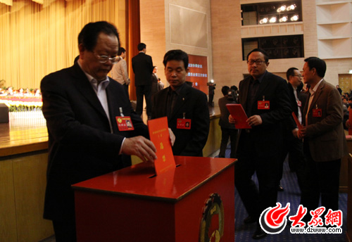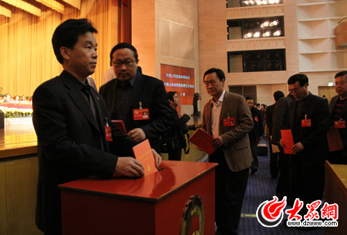 山東省政協十屆三次會議今天閉幕。圖為選舉大會現場,政協委員進行投票。