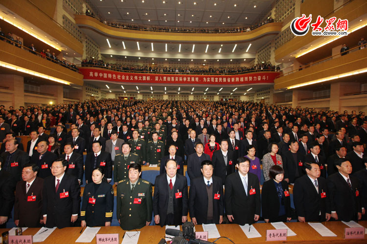 2月12日上午9時,山東省第十一屆人民代表大會第四次會議在濟(jì)南山東會堂隆重開幕。圖為在雄壯的國歌聲中,人大代表全體起立。