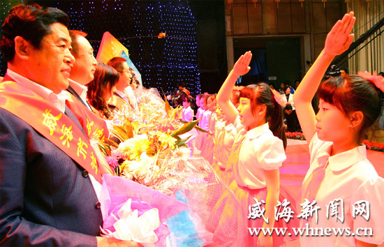 在昨日的頒獎典禮上,少先隊員向市道德模范獻花。(記者 夏志忠 攝)