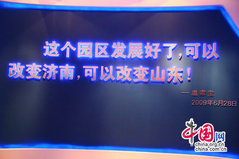 齊魯軟件園產(chǎn)品展廳內(nèi)懸掛著溫家寶總理對齊魯軟件園的鼓勵話語。中國網(wǎng)/傅陽 攝