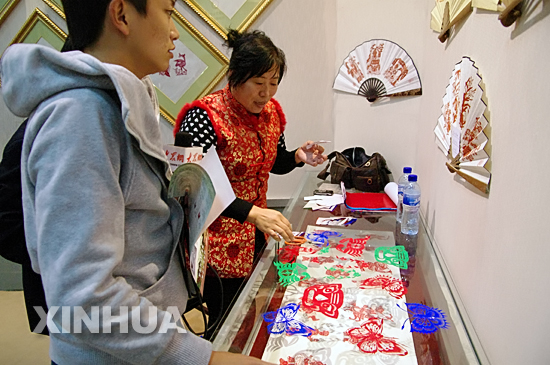 工作人員正在向記者展示剪紙藝術