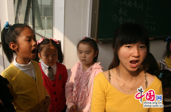 適逢周末,青島城陽(yáng)百姓樂(lè)園內(nèi)開(kāi)展了各種興趣學(xué)習(xí)班,圖為老師正在教小孩子們學(xué)習(xí)聲樂(lè)。(中國(guó)網(wǎng) 傅陽(yáng) 攝)