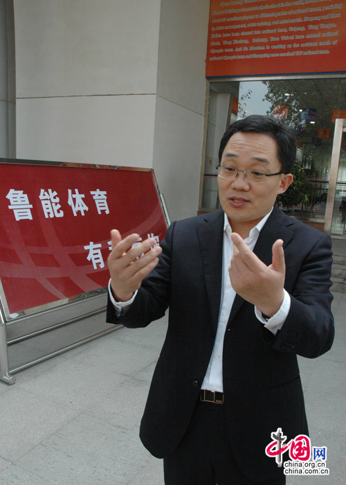 魯能足球學校、乒乓球學校黨委書記譚朝輝向記者介紹辦學情況。中國網 傅陽 攝