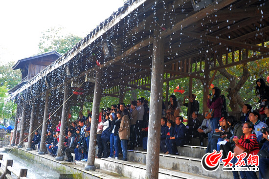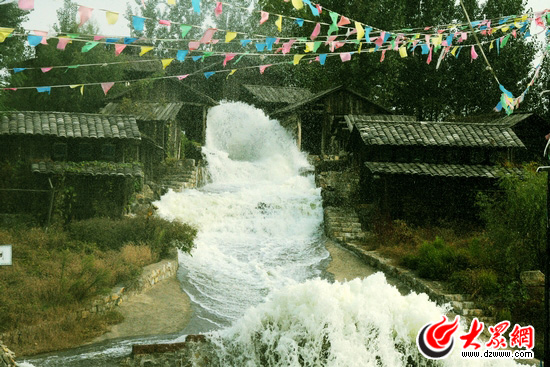走過古商鋪街,就是沂州城關區、府衙廟會區、沂水風情區、山村雨街區、山洪暴發區等不同的外景區域。在山洪暴發區,記者親眼目睹了山洪暴發一瞬的壯觀:隨著一陣雷鳴聲,建在斜坡上的小村子上空開始“下起雨來”。隨著“雨量”逐漸加大,一股洪流從村子的主干道噴涌而出,沿著斜坡呼嘯而下。“洪水”擊打在路面及兩邊的巖石上,翻滾出層層白浪,與此同時,“雨水”沿著觀眾席上的屋檐滴下。太陽當空照,但整個演出場所卻呈現出一片大雨滂沱之勢。