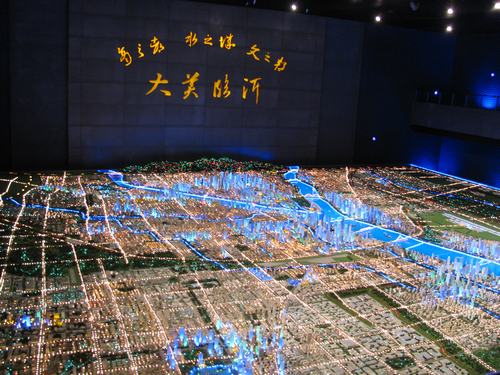 在采訪中記者看到,由全LED燈組成的“大美臨沂”規劃效果圖在6分鐘的時間內,通過明暗組合、聲光結合,介紹了臨沂市10年的城市總體規劃,最讓記者感到驚喜的是館內的環型“水幕長廊”,記者們漫步于“沂河水面”之上,頭上是藍天白云,河兩岸是規劃中的建筑模型,順著河面前行,就能看到與實際建筑成比例的電視塔、“帆船”樓,沂河兩岸的都市風景盡收眼底。