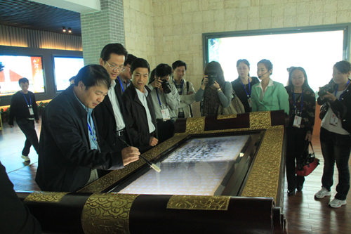 山東省網(wǎng)絡(luò)文化辦公室主任劉致福在臨沂規(guī)劃展覽館臨摹電子字