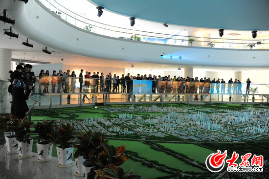 上午8點半,采訪團一行來到濰坊市文化藝術中心。城市藝術館以傳統木刻為原型,勞動文化宮外觀寓意著飛翔,科技館如同一架飛翔的紙飛機……一座座造型各異的建筑對稱地排布整個文化藝術中心空間之內,從空中俯瞰就如同一只展翅飛翔的風箏。據介紹,濰坊市文化藝術中心位于市級機關綜合辦公大樓以南,整個中心于2007年動工,共有5個組團、11個單體,共包括城市規劃藝術館、青少年宮、文化宮、圖書館、科技館、大劇院、音樂廳、雙塔和商業連廊等建筑設施,總建筑面積達31萬平方米!艾F在中心的城市規劃藝術館、工人文化宮和青少年宮已投入使,別的場館也會在2013年全部完成,到時候這里也將會成為濰坊的新地標”文化藝術中心建設指揮部的李主任對記者介紹說。