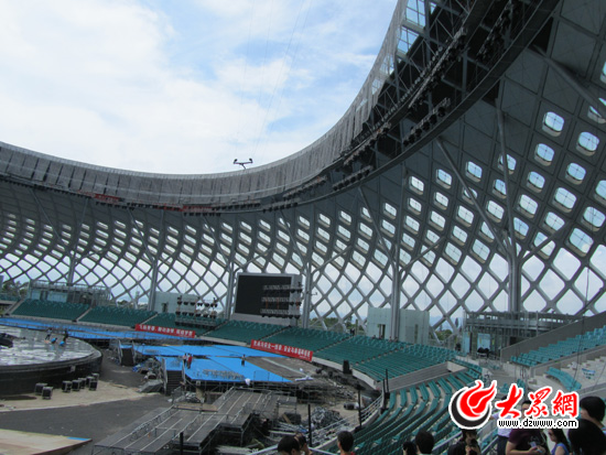 深圳灣體育中心坐落于深圳市南山后海中心區東北角,毗鄰香港,總建筑面積約32.6萬平方米。作為第26屆世界大學生夏季運動會的主要會場之一,深圳灣體育中心將在大運會期間承擔開幕式、乒乓球預決賽等功能。今天上午,大眾網記者跟隨全國網媒深圳大運采訪團來到這里。遠遠望去,體育中心網格狀的鋼結構好似一只大大的蠶繭,橫臥在深圳灣畔,采訪團的記者們立即被她獨特的造型吸引,紛紛舉起相機拍照。由于這種造型,體育中心被譽為“春繭”。此時“春繭”的主體育場內,正在緊張地進行開幕式舞臺的搭建,一群開幕式的演員正在烈日下緊張地排練。在體育場對面的體育館,硬件設施已經布置完畢,最具看點的是場地內的幾排可移動座椅,它們可以根據賽事的不同進行伸縮,僅這些座椅就可以容納上萬人。