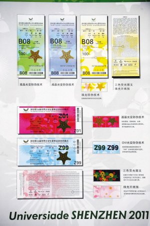 為防止偽造門票,大運會門票采用了多重防偽技術,包括OVI光變油墨、液晶光變油墨、三色熒光油墨等印刷防偽技術及DMC動態模式識別數字防偽技術。市民可以通過一看二摸三測試來檢驗真偽:一看,門票上的星星圖案,不同角度會變化不同色澤,同時門票采用珠光片防偽紙張,背面可見熒光色澤的亮片;二摸,門票上的星星圖案,用手一摸,不是光滑的,而是具有粗糙感;三測試,使用普通驗鈔機,可見大運會門票背面正中有3個“U”形的歡樂圖案。