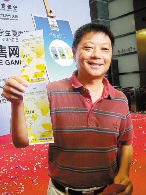 第一個購買到大運會門票的林先生展示門票