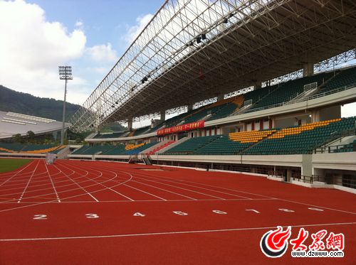 記者站在體育場,只見曲線型的看臺和正曲與反曲相結合的挑棚與筆直、高聳挺拔的拉索立柱形成鮮明的對比,既體現出體育運動優美和流暢的一面,又表達了其力量和剛毅的一面。場內,為了確保天然草皮的健康,工人們正在噴灑農藥。綠色的草坪、紅色跑道、藍色教練座椅、白色的挑棚,各種跳躍的顏色呈現在人們眼前,遠處的群山成為整個體育場的天然背景,使得這個地方被譽為“最美”的體育場。