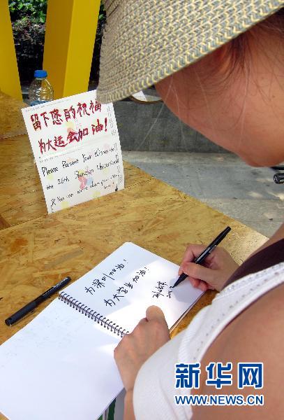 7月11日,市民在深圳大劇院U站為大運會寫下祝福。從7月1日起至大運會期間,被稱為“U站”的818個深圳大運會志愿者服務站將在深圳全面鋪開,為市民游客提供指路服務、門票場館信息和宣傳大運會等便民服務。新華社記者劉大偉攝