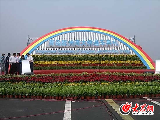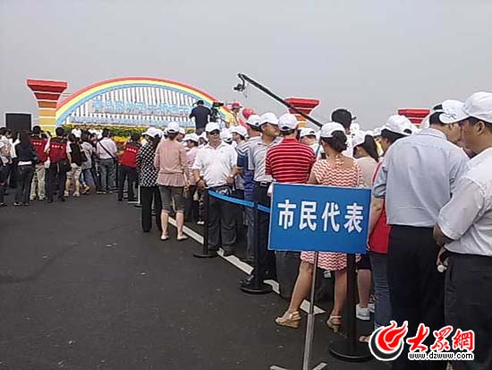 大眾網(wǎng)青島6月30日快訊 (記者 劉亮亮)記者來到通車典禮現(xiàn)場,各種彩旗和氣球為現(xiàn)場帶來濃濃的喜慶氣氛。輕霧籠罩下的膠州灣大橋氣貫長虹,若隱若現(xiàn)。大橋通車典禮在距離紅島出口500米的橋段舉行,記者看到現(xiàn)場彩虹橋已經(jīng)布置完成,軍樂隊正在就位,市民代表也早早來到現(xiàn)場,大家都在期待激動人心時刻的到來。