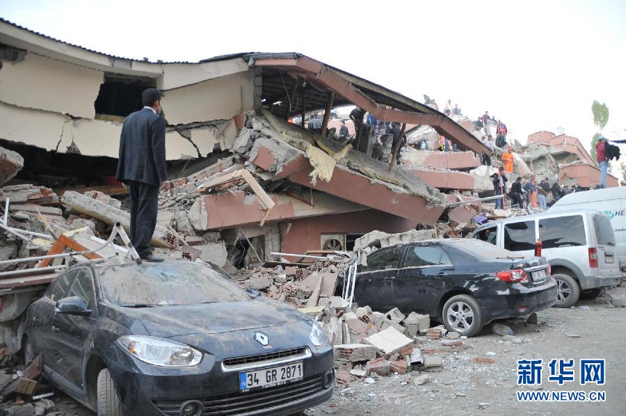 10月23日,在土耳其東部凡省,一名土耳其男子站在被壓在廢墟下的轎車上關注搜救。土耳其伊斯坦布爾地震研究中心已將凡省當天發生的地震級別由先前公布的里氏6.6級上調為里氏7.2級,并估計此次地震可能造成數百人死亡。新華社/阿納多盧通訊社