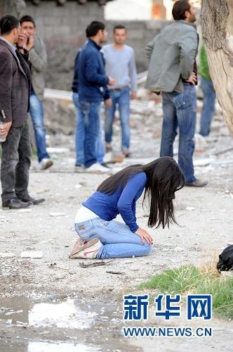 10月23日,在土耳其東部凡省,一名女子在地震后跪地痛哭。 新華社/阿納多盧通訊社