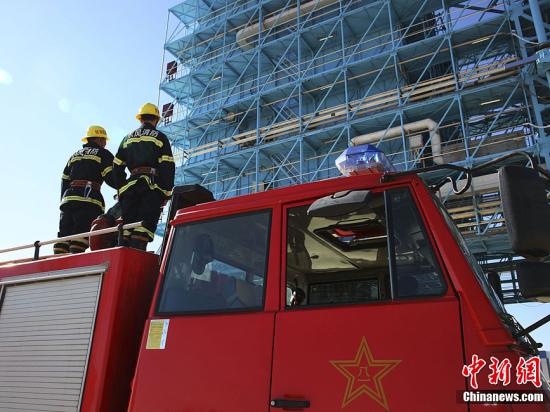 9月28日13時,天宮一號目標飛行器、長征二F運載火箭組合體開始加注。圖為消防應急人員在發射平臺值班。中新社發 秦憲安 攝