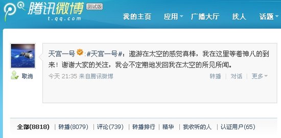 據了解, “天宮一號”早在9月21日便正式入駐了騰訊微博,由中國載人航天工程辦公室獨家授權,中國載人航天工程網獨家發布。與傳統科研信息發布的嚴肅風格所不同的是,“天宮一號”以第一人稱發布信息,首度嘗試擬人化的打造載人航天科普大使的形象。上線僅8天就被數十萬網友收聽,還被聽眾們親切的稱為“天宮哥”。
