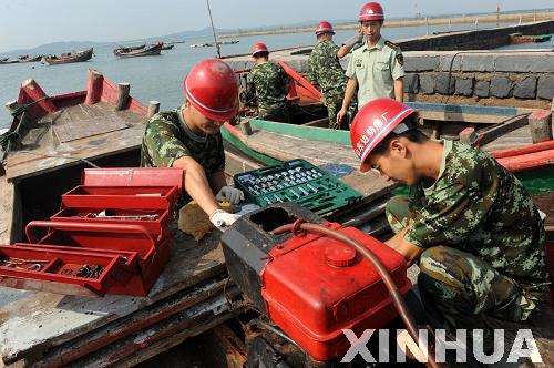 9月5日,船艇修理廠官兵來到青島市膠南東山村漁碼頭為漁民維修漁船。新華社記者 李紫恒 攝