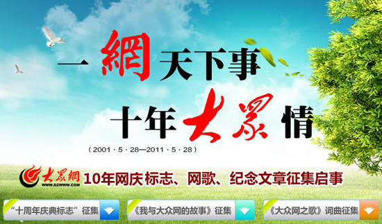 “十周年慶典標(biāo)志”征集設(shè)金獎(jiǎng)一名,獎(jiǎng)金5000元。作品要求能夠體現(xiàn)“一網(wǎng)天下事,十年大眾情”的主題思想,富有時(shí)代感、大氣,形象要簡潔、寓意深刻、設(shè)計(jì)感強(qiáng),能夠展現(xiàn)新聞與網(wǎng)絡(luò)傳媒的特性,給人深刻印象且便于傳播。