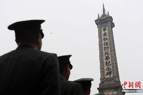 10月8日,四川各界代表數百人聚集在位于成都市人民公園內的辛亥秋保路死事紀念碑前,參加辛亥革命暨四川保路運動100周年紀念活動,緬懷在辛亥革命和四川保路運動中犧牲的民主志士和革命先烈。圖為紀念活動現場。中新社發 張浪 攝