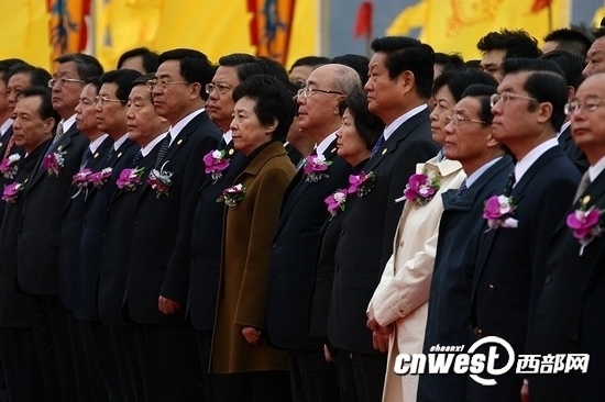 大眾網訊 天地祥,紫氣騰,四海華裔,同祭黃陵。4月5日上午,辛卯(2011)年清明公祭軒轅黃帝典禮在陜西黃帝陵隆重舉行,海內外一萬多名中華兒女代表齊聚橋山軒轅殿祭祀廣場,滿懷虔誠地參加公祭典禮,追念人文初祖功德,表達炎黃子孫追思。