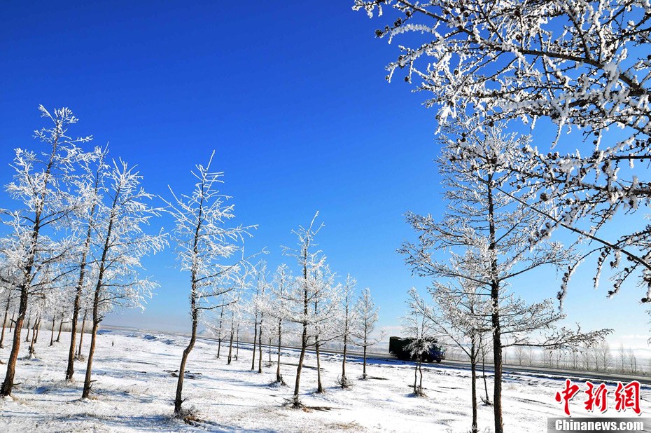 11月5日,內蒙古牙克石市出現霧凇美景。11月2-3日,內蒙古大部地區迎來入冬以來的第一場大范圍降雨或雨夾雪天氣。由于連續降溫,牙克石市提前迎來霧凇景觀。中新社發 余昌軍 攝 圖片來源:CNSPHOTO