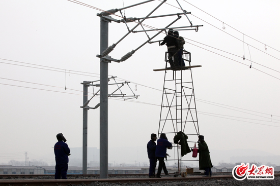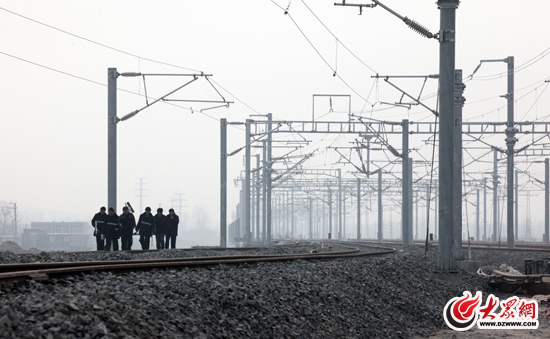 2月8日接近中午12點,初春暖陽下寒風依舊料峭。一群頭戴皮帽、身穿藍色工作服的鐵路工人冒寒在京滬高鐵西客站鐵道工地上干得起勁兒。此時,胡克俊副段長與姚志剛隊長正在道軌上向中鐵電氣化局項目經(jīng)理匯報工程進展情況 。因為他們要提前完成工程,保障京滬高鐵濟南段西客站本月18日前能夠送電。