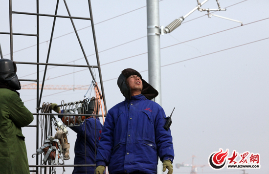 王志強與姚志剛同是河南老鄉(xiāng),兩人今年都42歲,在王志強眼里,隊長姚志剛是個只知道悶頭干活的漢子。記者采訪期間,姚志剛與幾個小弟兄們一直推著5米多高的云梯忙著吊弦工作。等到中午工歇吃飯的時間了,他才抽出時間與記者搭話。我這才發(fā)現(xiàn),他那張被耷下的皮冒下遮蓋的臉是那么黝黑。交談間,他不善言辭,而他說出的像“隔離開關(guān) 、絕緣器、上網(wǎng)線”、“架線、吊弦、挽臂”等一串串專業(yè)名詞卻讓記者聽得云里霧里的。他說,根據(jù)上級安排,他們 一行40多人于去年12月份從哈大高鐵線上下來之后,就趕到了京滬高鐵線濟南西客站段,主要任務(wù)是負責三個股道的長 達三公里的鐵路電氣安裝調(diào)試工作。春節(jié)期間,他們的隊伍只剩下了二三十個人仍堅守一線。
