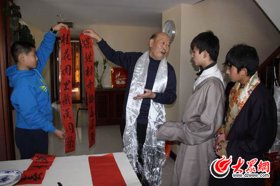 客廳的桌子上早就擺好了紅紙和筆硯,“孩子們過來(lái),這是我剛剛寫好的對(duì)聯(lián)。”桑漫坤的爺爺桑炳明是中國(guó)楹聯(lián)學(xué)會(huì)會(huì)員、楹聯(lián)專家,他給孩子們說(shuō)起春聯(lián)興致盎然,“咱們對(duì)聯(lián)啊,分上聯(lián)和下聯(lián),我寫的上聯(lián)是媒體村中梅春并至,下聯(lián)是桂花園內(nèi)藏漢同歡,橫批藏漢新春。走,咱們一塊把春聯(lián)貼上吧。”