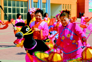 2月7日,膠州鄭家小莊村“莊戶劇團(tuán)”正樂呵呵地“跑旱船”,把祝福送給鄉(xiāng)親。