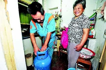 在無影山社區王大娘家里,百江液化氣的工作人員給王大娘更換了全新的煤氣罐。