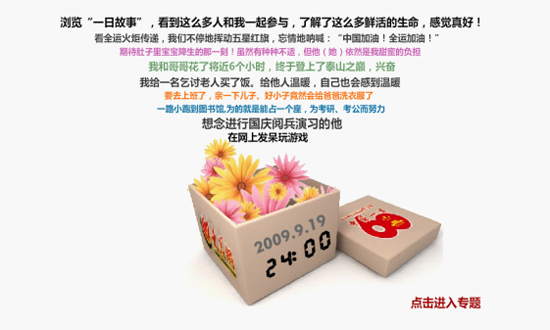 當時,會上大家爭論得很激烈,關于第一個頁面怎么表現更好?有人說字要豎著從盒子里出來,有人說還是橫著出來好;有人說盒子上放時間好,有人說還是放中國一日的標志好;有人說盒子上的時間一秒鐘跳一小時好,有人說一秒跳兩小時更好……最后,朱總急了,當即拍板:“這么個爭論法,這個專題兩天也出不來。盒子上放時間、放國新辦統一制作的活動logo、放大眾網標準字及logo;挑選讀者精彩的句子在盒子里飛出來……