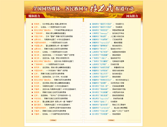 后方編輯還根據(jù)采訪團(tuán)隊(duì)行程提前聯(lián)系了全國(guó)90余家重點(diǎn)新聞網(wǎng)站和國(guó)內(nèi)知名媒體共同參與報(bào)道,為了更好的呈現(xiàn)90家網(wǎng)站和媒體的接力報(bào)道,專題開(kāi)設(shè)“接力式互動(dòng)報(bào)道”版塊。前方采訪團(tuán)每到一個(gè)地方,當(dāng)?shù)鼐W(wǎng)站媒體記者積極參與報(bào)道并拿出重要位置進(jìn)行推薦,在當(dāng)?shù)匾饛?qiáng)烈的反響,編輯及時(shí)將各媒體的稿件匯總,發(fā)布到專題中,形成了90家媒體聚焦中華大家庭的盛況。為擴(kuò)大活動(dòng)影響力,采訪活動(dòng)分別在大眾網(wǎng)、新浪、騰訊開(kāi)設(shè)實(shí)名認(rèn)證的官方微博,前方記者隨時(shí)隨地與網(wǎng)友在線互動(dòng)交流,數(shù)十萬(wàn)網(wǎng)友踴躍參與,共寫(xiě)中華全家福。