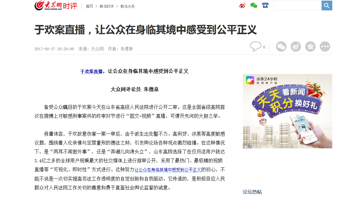 大眾網評論《于歡案直播,讓公眾在身臨其境中感受到公平正義》獲中國新聞獎二等獎