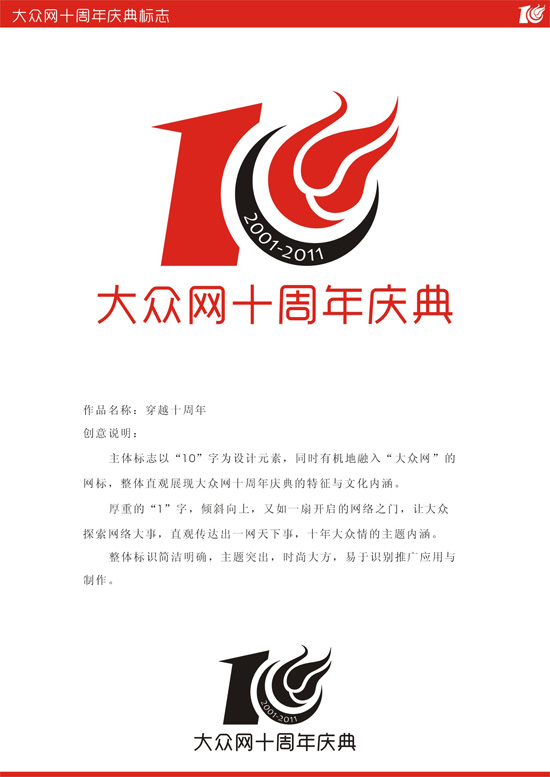 [提要] 主體標(biāo)志以“10”字為設(shè)計(jì)元素,同時(shí)有機(jī)地融入“大眾網(wǎng)”的網(wǎng)標(biāo),整體直觀展現(xiàn)大眾網(wǎng)十周年慶典的特征與文化內(nèi)涵。