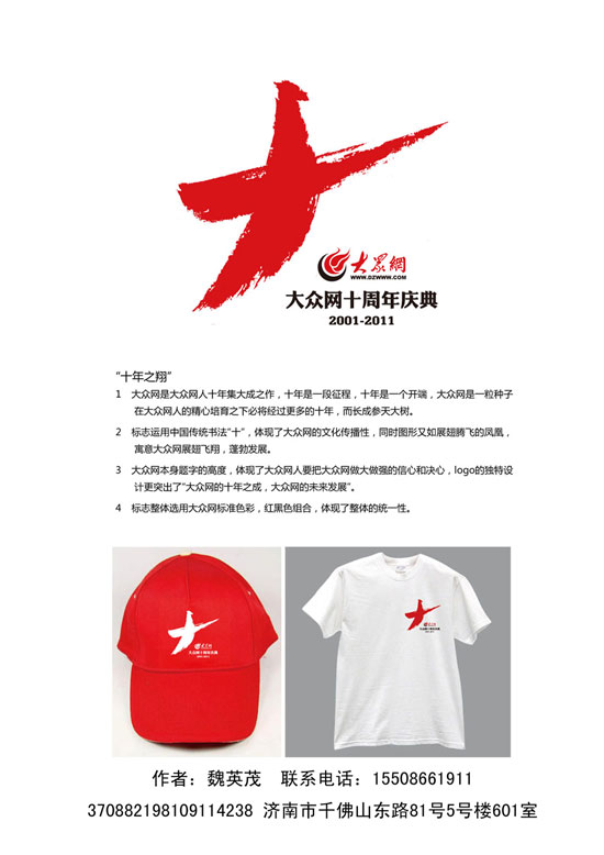 標志運用中國傳統書法“十”,體現了大眾網的文化傳播性,同時圖形又如展翅騰飛的鳳凰,寓意大眾網展翅飛翔,蓬勃發展。